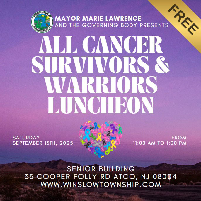 Honoring strength and resilience! The Winslow Township Free All Cancers Warriors & Survivors Celebration is a heartfelt event dedicated to those who have been impacted by cancer. Join us on Saturday, September 13, 2025, from 11 AM to 2 PM at the Bud Duble Senior Center – 33 Cooper Folly Road, Atco, NJ 08004. Registration is required by Thursday, August 28, 2025, for this inspiring health awareness event and cancer support in Atco, NJ.